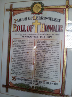 Top of scroll inside wreath: NO / VICTORY / WORTH HAVING / WAS EVER WON / WITHOUT COST // PARISH OF HERRINGFLEET / ROLL OF (Cross) HONOUR / NAMES OF THE MEN OF THIS PARISH WHO SERVED IN HIS MAJESTY'S FORCES / THE GREAT WAR 1914-1919 / (Names in two columns) / Be thou faithful unto death and I will give thee / a crown of life / Rev. 2.10 //