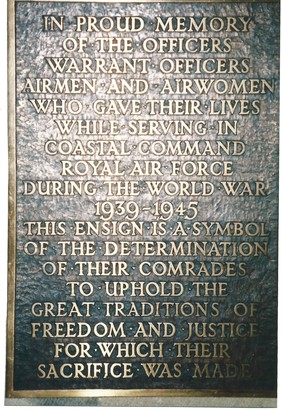 IN PROUD MEMORY/OF THE OFFICERS/WARRANT OFFICERS/AIRMEN AND AIRWOMEN/WHO GAVE THEIR LIVES/WHILE SERVING IN/COASTAL COMMAND/ROYAL AIR FORCE/DURING THE WORLD WAR/1939-1945/THIS ENSIGN IS A SYMBOL/OF THE DETERMINATION/OF THEIR COMRADES/TO UPHILD THE/GREAT TRADITIONS OF/FREEDOM AND JUSTICE/FOR WHICH THEIR/SACRIFICE WAS MADE