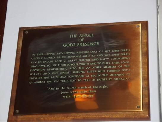 THE ANGEL/OF/GOD'S PLEASURE/IN EVER-LIVING AND LOVING REMEMBRANCE OF W/T CHIEF WREN/CECILLY MONICA BRUCE BENJAMIN AGE 20 AND W/T CHIEF WREN/PHYLLIS BACON AGED 21 GREAT FRIENDS AND HAPPY COMPANIONS/WHO GAVE TO LIFE THEIR JOYOUS YOUTH AND TO DUTY THEIR LOYAL/ DEVOTION/ REMEMBERING ALSO THE TWENTY OTHER MEMBERS OF THE/ W.R.N.S. AND ONE NAVAL NURSING OFFICER WHO PERISHED WITH/ THEM IN THE S.S.AGUILA, TORPEDOED AT SEA IN THE MORNING OF/ 19TH AUGUST 1941 ON THEIR WAY TO TAKE UP DUTIES AT GIBRALTER/ "AND IN THE FOURTH WATCH OF THE NIGHT JESUS WENT UNTO THEM WALKING ON THE SEA"