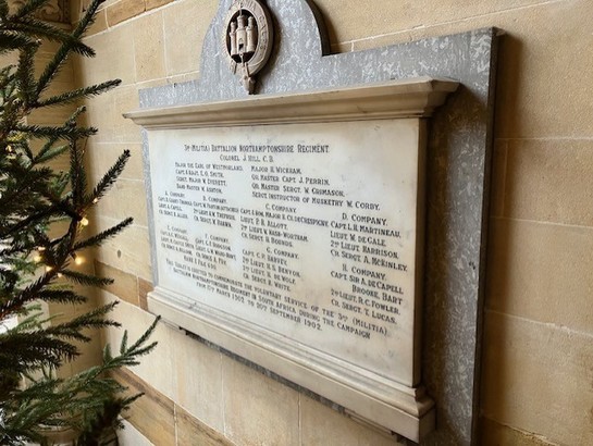 3RD (MILITIA) BATTALION NORTHAMPTONSHIRE REGIMENT/ (NAMES)/ THIS TABLET IS ERECTED TO COMMEMORATE THE VOLUNTARY SERVICE OF THE 3RD (MILITIA)/ BATTALION NORTHAMPTONSHIRE REGIMENT IN SOUTH AFRICA DURING THE CAMPAIGN/ FROM 17TH MARCH 1902 TO 20TH SEPTEMBER 1902