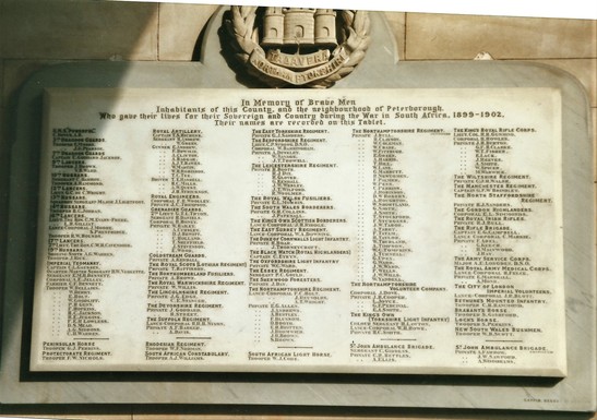 In Memory of Brave Men / Inhabitants of this County, and the neighbourhood of Peterborough, / who gave their lives for their Sovereign and Country during the War in South Africa, 1899 - 1902,/ Their names are recorded in this table. / (195 NAMES)