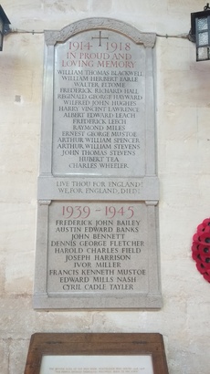 WW1- William Thomas Blackwell/ William Herbert Earle/ Walter Eltome/ Frederick Richard Hall/ Reginald George Hayward/ Wilfred John Hughes/ Harry Vincent Lawrence/ Albert Edward Leach/ Frederick Leech/ Raymond Miles/ Ernest George Mustoe/ Arthur William Spencer/ Arthur William Stevens/ John Thomas Stevens/ Hubert Tea/ Charles Wheeler; WW2- Frederick John Bailey/ Austin Edward Banks/ John Bennett/ Dennis George Fletcher/ Harold Charles Field/ Joseph Harrison/ Ivor Miller/ Francis Kenneth Mustoe/ Edward Mills Nash/ Cyril Cadle Tayler