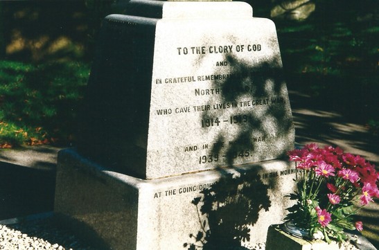 TO THE GLORY OF GOD/ AND/ IN GRATEFUL REMEMBRANCE OF THE MEN OF/ NORTH WEALD/ WHO GAVE THEIR LIVES IN THE GREAT WAR/ 1914-1918/ AND IN THE WORLD WAR/ 1939-1945/ AT THE GOING DOWN OF THE SUN AND IN THE MORNING/ WE WILL REMEMBER THEM (Names on other faces)