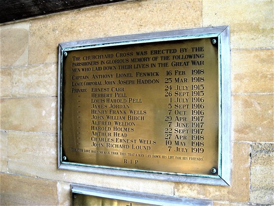 “The Churchyard Cross was erected by the Parishioners in grateful memory of those who laid down their lives in the Great War (here follows twelve names), with rank, regiment, place and date of death) R.I.P.” “Greater love have no man than this, that a man lay down his life for his friends”