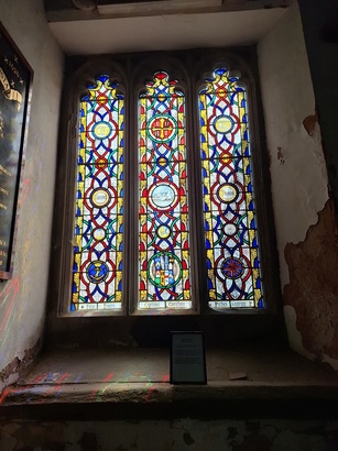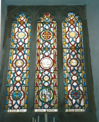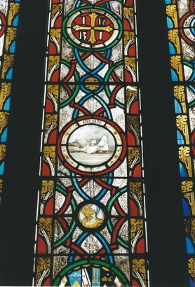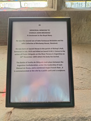 This window was placed as a memorial to Charles John Brickdale, second son of John Fortescue Brickdale and Catherine, his wife, of Bircham in this parish. Lieutenant in the Royal Navy, which rank he obtained in the Royal Naval College, Portsmouth, in 1842. He was born in Urcott House in the parish of Bishop's Hull, Somerset, 30th July 1819 and was killed in the action off Port Obligado in the River Parana in South America 20th November 1845. As his life was exemplary so was his death glorious. His body lies buried on the shore of the Parana. His spirit returned to the God who gave it.
