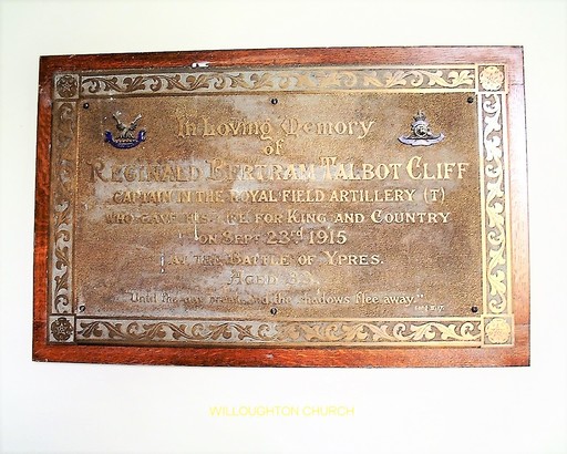 IN LOVING MEMORY/ OF/ REGINALD BERTHAM TALBOT CLIFF/ CAPTAIN IN THE ROYAL FIELD ARTILLERY (T)/ WHO GVE HIS LIFE FOR KING AND COUNTRY/ ON SEPT. 23RD 1915/ AT THE BATTLE OF YPRES./ AGED 33/ "UNTIL THE DAY BREAKS AND THE SHADOWS FLEE AWAY"/ SONG.II.17