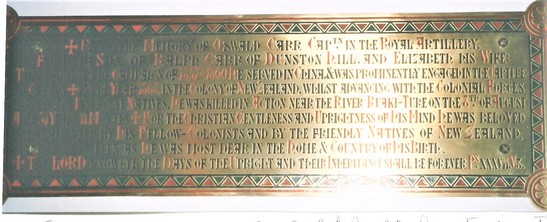 Unto the memory of Oswald Carr, Captain in the Royal Artillery. Fourth son of Ralph Carr of Dunston Hill, and Elizabeth, his wife. Throughout the campaign of 1857-60 he served in China, and was prominently engaged in the capture of Canton. In the year 1868 in the colony of New Zealand, whilst advancing with the colonial forces against insurgent natives, he was killed in action near the River Ruaki-Turi on the 8th of August aged 31 years and 11 months. By the Christian gentleness and uprightness of his mind he was beloved and lamented by his fellow-colonists and by the friendly natives of New Zealand even as he was most dear in the home and country of his birth. The Lord knoweth the days of the Upright and their inheritance shall be forever. Ps XXXVII v18