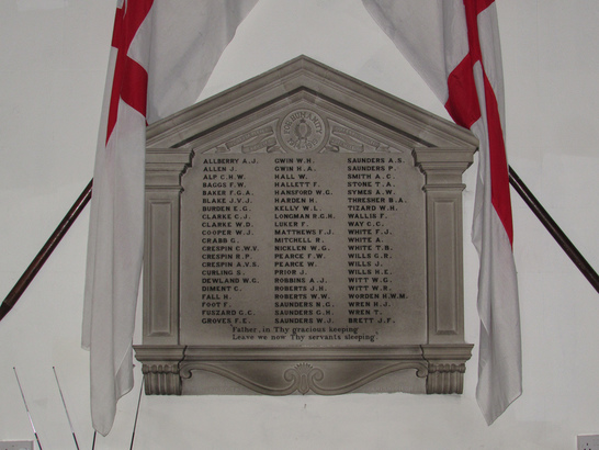 PRO REGE, LEGE ET GREGE/ FOR HUMANITY, 1914-1919/ DULCE ET DECORUM EST PRO PATRIA MORI/ [63 names in three columns]/ "Father, in Thy gracious keeping/ Leave we now Thy servants sleeping."/ ERECTED BY THE PARISHIONERS