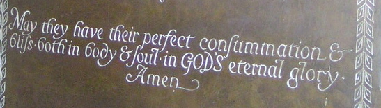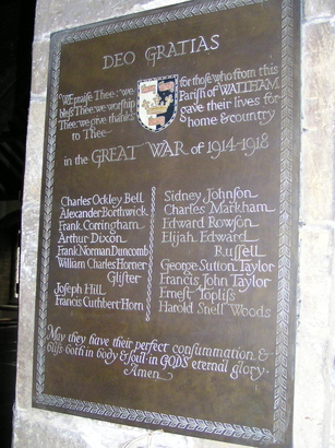 Deo Gratias We praise thee: we bless Thee: we worship Thee: we give thanks to Thee for those who from this Parish of Waltham gave their lives for home & country in the Great War 1914-1918 May they have their perfect consummation & bliss in body & soul in GOD'S eternal glory. Amen.
