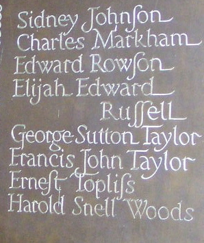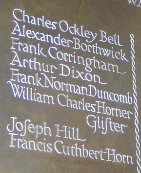 Charles Ockley Bell Sidney Johnson Alexander Borthwick Charles Markham Frank Corringham Edward Rowson Arthur Dixon Elijah Edward Russell Frank Norman Duncomb George Sutton Taylor William Charles Horner Glister Francis John Taylor Joseph Hill Ernest Topliss Francis Cuthbert Horn Harold Snell Woods