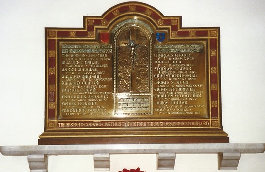 IN HONOURED MEMORY OF THOSE/ WHO SACRIFICED THEIR LIVES FOR / THEIR GOD THEIR KING AND COUNTRY/ IN THE GREAT WAR 1914 - 1918/ (Names)/ THANKS BE TO GOD WHO GIVETH US THE/ VICTORY THROUGH JESUS CHRIST OUR LORD