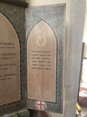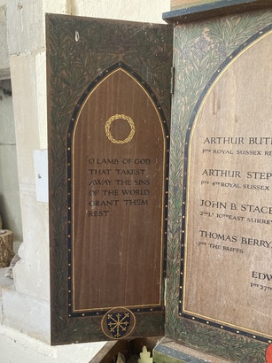 Top: 1914 THE GREAT WAR 1918 Left panel: O LAMB OF GOD THAT TAKEST/ AWAY THE SINS/ OF THE WORLD/ GRANT THEM REST. Right panel: WITH HIS RIGHT/ HAND SHALL HE/ COVER THEM/ AND WITH HIS/ ARM SHALL HE/ PROTECT THEM. Centre panel: (Names)/ R.I.P.