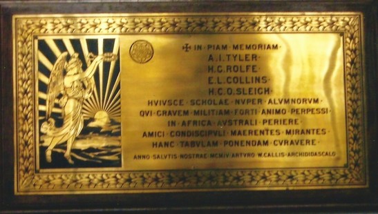 IN PIAM MEMORIAM/ [NAMES]. HVIVSCE SCHOLAE NVPER ALVMNORVM/ QUI GRAVEM MILITIAM FORTI ANIMO PERPESSI/ IN AFRICA AVSTRALI PERIERE/ AMICI CONDISCIPVLI MAERENTES MIRANTES/ HANC TABVCAM PONENDAM CVRAVERE/ ANNO SALUTIS NOSTRAE MCMIV ARTURO W . CALLIS ARCHIDIDASCALO* * Translation - IN PEOPLE MEMORY/ [NAMES]. FOR ALL THE STUDENTS OF TODAY'S SCHOOL / WHO ENDURED THE HARD MILITARY WITH A STRONG MIND / TO PERISH IN AUSTRALIA AFRICA / FRIENDS MOURNING AND WONDERING CLASSMATES / TO KEEP THIS BOARD PLACED / IN THE YEAR OF OUR SALVATION 1904 ARTHUR W. CALLIS ARCHIDASCALO