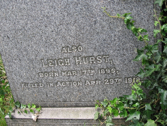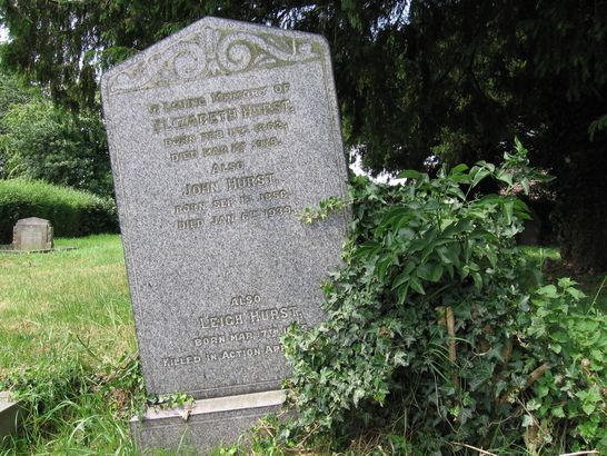 IN LOVING MEMORY OF/ ELIZABETH HURST,/ BORN FEB 11TH 1862,/ DIED MAR 1ST 1919./ ALSO/ JOHN HURST,/ BORN SEP 1ST 1856,/ DIED JAN 6TH 1939./ ALSO/ LEIGH HURST,/ BORN MAR 17TH 1895,/ KILLED IN ACTION APR 29TH 1918