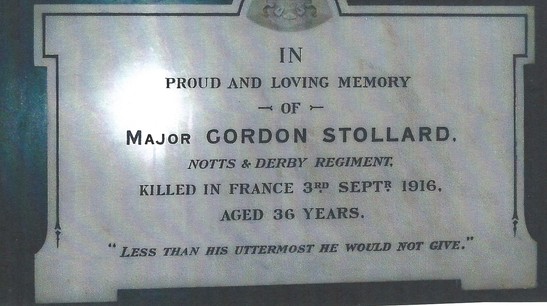 In / proud and loving memory / of / Major Gordon Stollard, / Notts & Derby Regiment, / killed in France 3rd. Septr. 1916, / aged 36 years. / "Less than his uttermost he would not give."