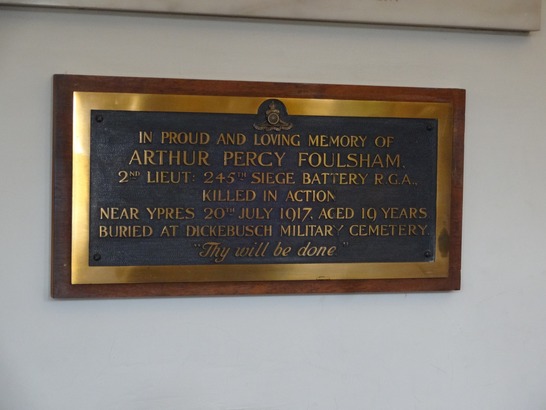 IN PROUD AND LOVING MEMORY OF/ ARTHUR PERCY FOULSHAM, / 2ND LIEUT. 245TH SIEGE BATTERY R.G.A., / KILLED IN ACTION/ NEAR YPRES 20TH JULY 1917, AGED 19 YEARS. / BURIED AT DICKEBUSH MILITARY/ CEMETERY. / "THY WILL BE DONE."
