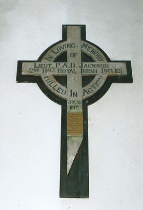 IN LOVING MEMORY/ OF/ LIEUT. P.A.D. JACKSON/ 2ND BATT ROYAL RISH RIFLES/ KILLED IN ACTION/ 4TH JAN 1917. Plaque: LIEUT PATRICK ARTHUR/ DUDLEY JACKSON/ 2ND BATT/ ROYAL IRISH RIFLES/ ONLY SON OF/ LT COL AND MRS CECIL JACKSON/ KILLED IN ACTION AT YPRES/ JAN 4TH 1917/ AGED 19/ OBTAINED HIS COMMISSION 1914/ SERVED IN FRANCE 1915