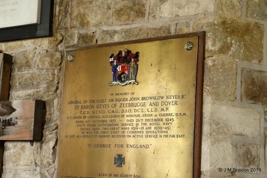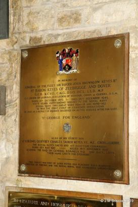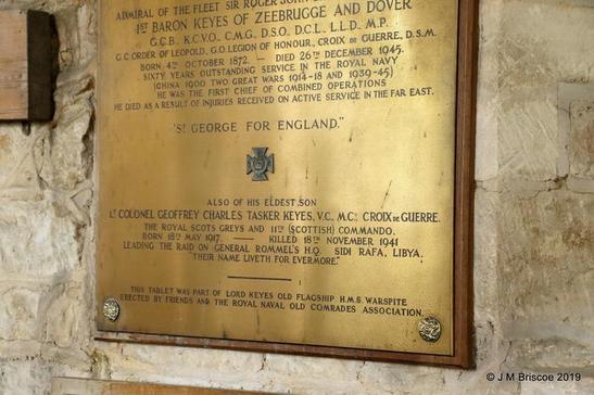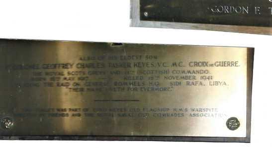 IN MEMORY OF/ ADMIRAL OF THE FLEET SIR ROGER JOHN BROWNLOW KEYES BT/ 1ST BARON KEYES OF ZEEBRUGGE AND DOVER/ GCB KCVO CMG DSO DCL LLD MP/ GC ORDER OF LEOPOLD GO LEGION OF HONOUR CROIX DE GUERRE DSM/ BORN 4TH OCTOBER 1872 DIED 26TH DECEMBER 1945/ SIXTY YEARS OUTSTANDING SERVICE IN THE ROYAL NAVY (CHINA 1900 TWO GREAT WARS 1914-1918 1939-1945)/ HE WAS THE FIRST CHIEF OF COMBINED OPERATIONS/ HE DIED AS A RESULT OF INJURIES RECEIVED ON ACTIVE SERVICE IN THE FAR EAST/ ST GEORGE FOR ENGLAND/ ALSO OF HIS ELDEST SON/ LT COLONEL GEOFFREY CHARLES TASKER KEYES VC MC CROIX DE GUERRE/ THE ROYAL SCOTS GREYS AND 11TH (SCOTTISH) COMMANDO/ BORN 18TH MAY 1917 - KILLED 18TH NOVEMBER 1941/ LEADING THE RAID ON GENERAL ROMMELS HQ, SIDI RAFA LIBYA/ THEIR NAME LIVETH FOR EVERMORE/ THIS TABLET WAS PART OF LORD KEYES' OLD FLAGSHIP HMS WARSPITE/ ERECTED BY FRIENDS AND THE ROYAL NAVAL OLD COMRADES ASSOCIATION