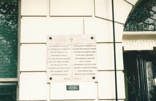 (On tablet) This plaque is erected to commemmorate the deeds of/ men and women of the Free French forces/ and their British comrades/ who left from this house/ on special missions/ to enemy occupied France/ and to honour those who did not return/ 1941-1944 (REPEATED IN FRENCH) (On plaque) This plaque was unveiled by/ HER MAJESTY/ QUEEN ELIZABETH THE QUEEN MOTHER/ on the 15th June 1957