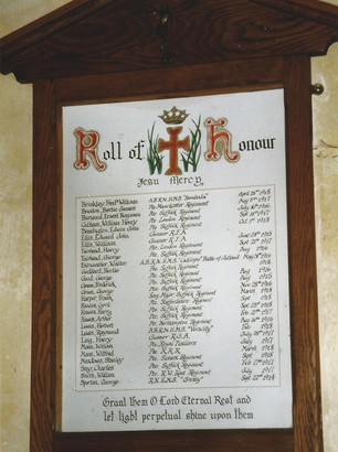 Brinkley, Fredk. William A.B.R.N. H.M.S. Bombala April 25th 1918, Brunton, Bertie James Pte. Manchester Regiment Aug 5th 1917, Burwood, Ernest Benjamin Pte. Suffolk Regiment July 16th 1916, Culham, William Henry Pte. London Regiment Sept 14th 1917, Dennington, Edwin John Pte. Suffolk Regiment Oct 1st 1918, Ellis, Edward John Gunner R.F.A., Ellis, William Gunner R.F.A. June 24th 1915, Fairhead, Harry Pte. London Regiment Sept 21st 1917, Fairhead, George Pte. Suffolk Regiment Aug 1916, Fairweather, Walter A.B.R.N. H.M.S. "Calliope" Battle of Jutland May 31st 1916, Goddard, Bertie Pte. Suffolk Regiment 1918, Good, George Pte. Suffolk Regiment 1918, Green, Frederick Pte. Suffolk Regiment Aug 1915, Green, George Pte. Suffolk Regiment Nov 28th 1916, Harper, Frank Serg. Major Suffolk Regiment March 1918, Hawes, Cyril Pte. Staffordshire Regiment Sept 1918, Hawes, Harry Pte. Suffolk Regiment Sept 23rd 1918, Hawes, Arthur Pte. Suffolk Regiment Feb 27th 1917, Lewis, Herbert Pte. Northampton Regiment Aug 16th 1916, Lewis, Raymond A.B.R.N. H.M.S. "Veracity" Feb 1918, Ling, Harry Gunner R.G.A. July 28th 1917, Mann, William Pte. Royal Fusiliers July 1917, Mann, Wilfred Pte. K.R.R. March 1918, Meadows, Stanley Pte. Sussex Regiment Sept 1918, Smy, Charles Pte. Suffolk Regiment Feb 17th 1917, Smith, William Pte. R.W. Kent Regiment July 1917, Sporton, George R.N. H.M.S. "Gressy"Sept 22nd 1914.
