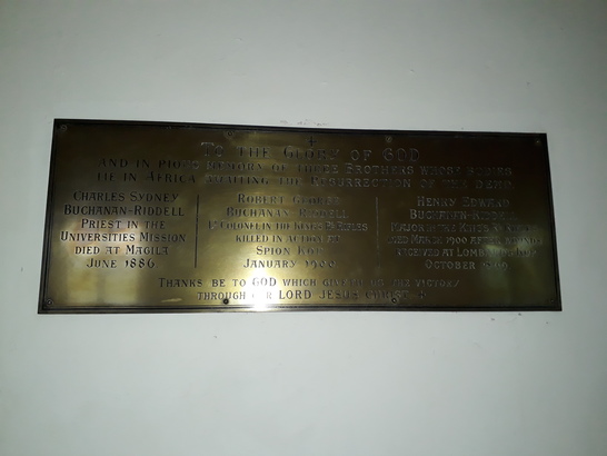 TO THE GLORY OF GOD/ AND IN PIOUS MEMORY OF TWO BROTHERS WHOSE BODIES/ LIE IN AFRICA AWAITING THE RESURRECTION OF THE DEAD/ (names)/ THANKS BE TO GOD WHICH GIVETH US THE VICTORY/ THROUGH OUR LORD JESUS CHRIST.