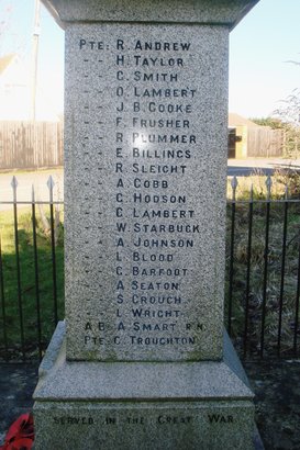 1914 – 1919 GAVE THEIR LIVES FOR KING & COUNTRY _______ L.CPL : S. BARTON PTE. F. THOUGHTON - - G. WALTON - - T. ALLEN - - P. TAYLOR - - T. H. ALLEN - - E. TANSLEY S. C. G. FLOWERS : R,N, PTE. W. BERRIDGE 1939 – 1945 PILOT OFFICER A. FENNELL. RAF PTE. G. FRUSHER LAC E. J. LONG RAF. CPL. S. PAGE. RAF PTE. R. WINTERS R.E. LE. CDR. R. R. COOKE. R.N. 31-3-1951 Right Hand Side: PTE: R. ANDREW - - H. TAYLOR - - C. SMITH - - O. LAMBERT - - J. B. COOKE - - F. FRUSHER - - R. PLUMMER - - E. BILLINGS - - R. SLEIGHT - - A. COBB - - G. HODSON - - C. LAMBERT - - W. STARBUCK - - A. JOHNSON - - L. BLOOD - - G. BARFOOT - - A. SEATON - - S. CROUCH - - L. WRIGHT A. B. A. SMART. R.N. PTE : C. TROUGHTON SERVED IN THE GREAT WAR Left Hand Side CAPT: A. S. COATES C.S.M. S. J. LAVENDER SERGT: F. HARE - - A. BUNN - - M. TAYLOR CORPL: T. CAVE - - A. BULLOCK GUNNER: A. TAYLOR - - H. A. CROUCH BOMDR J. BOOTH PTE. J. BILLINGS - - HY TAYLOR - - E. WRIGHT - - S. SEATON - - G. JACKSON - - S. STOKES - - R. GAULTY - - W. STOKES - - W. READER - - W. BLOWS (KILLED) - - A. E DUNN C DE G PTE. C. T. CROUCH SERVED IN THE GREAT WAR