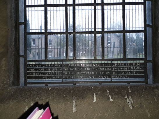 IN LOVING MEMORY/ OF JONATHAN MACKAY, TELEGRAPHIST, R.N./ WHO GAVE HIS LIFE IN THE BATTLE OF CRETE 22ND MAY 1941 WHILE SERVING/ IN H.M.S. WARSPITE. THIS WINDOW IS ERECTED BY HIS PARENTS/ WILLIAM GEORGE AND JANE ANNE MACKAY