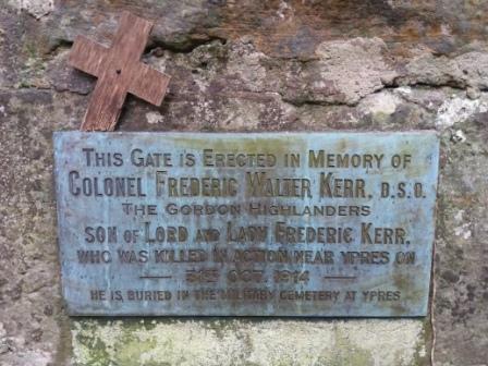 This gate is erected in memory of Colonel Frederic Walter Kerr D.S.O the Gordon Highlanders. Son of Lord and Lady Frederic Kerr, who was killed in action at Ypres on 31st Oct. 1914. He is buried in the military cemetery at Ypres.