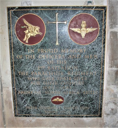 IN PROUD MEMEMORY OF THE OFFICERS AND MEN OF THE 2ND BATTALION THE PARACHUTE REGIMENT WHO GAVE THEIR LIVES FOR THEIR COUNTRY 1942 1943 BRUNEVAL NORTH AFRICA SICILY THEIR COMRADES PLACED THIS TABLET HERE