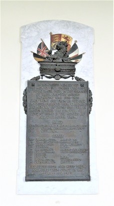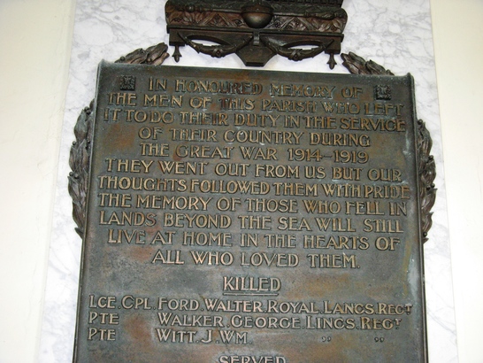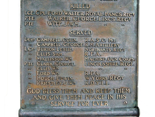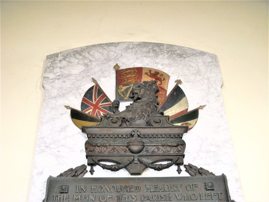 IN HONOURED MEMORY OF/ THE MEN OF THIS PARISH WHO LEFT/ IT TO DO THEIR DUTY IN THE SERVICE/ OF THEIR COUNTRY DURING/ THE GREAT WAR 1914 - 1919/ THEY WENT OUT FROM US BUT OUR/ THOUGHTS FOLLOWED THEM WITH PRIDE./ THE MEMORY OF THOSE WHO FELL IN/ LANDS BEYOND THE SEA WILL STILL/ LIVE AT HOME IN THE HEARTS OF/ ALL WHO LOVED THEM./ KILLED (Names)/ SERVED (Names)/ GOD BLESS THEM AND KEEP THEM/ AND GIVE THEM PLACE IN HIS/ SERVICE FOR EVER