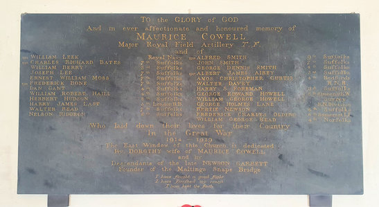 Window: It is sown a Natural Body : It is raised a Spiritual Body / THE REAPERS ARE WE ANGELS // Tablet: TO the GLORY of GOD / and in ever affectionate memory of / MAURICE COWELL / Major Royal Field Artillery T.F. / and of / (26 NAMES) / Who laid down their lives for their Country / In the Great War / 1914-1919 / The East Window of this Church is dedicated / by DOROTHY wife of MAURICE COWELL / and by / Descendants of the late NEWSON GARRETT / Founder of the Maltings Snape Bridge / I have fought a good fight / I have finished my course / I have kept the faith //