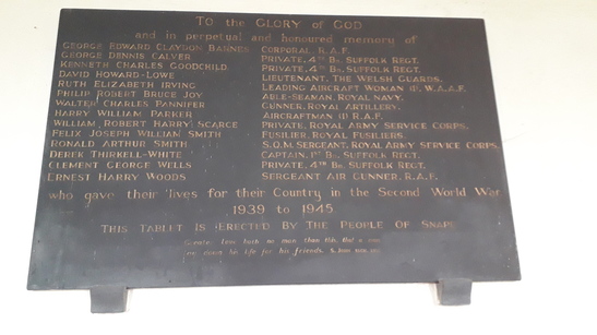 To the GLORY of GOD and in perpetual and honoured memory of... Who gave their lives for their Country in the Second World WaR 1939-1945 THIS TABLET IS ERECTED BY THE PEOPLE OF SNAPE Greater LOve hath no man than this, that a man should lay down his life for his friends. S. John 15CH ..