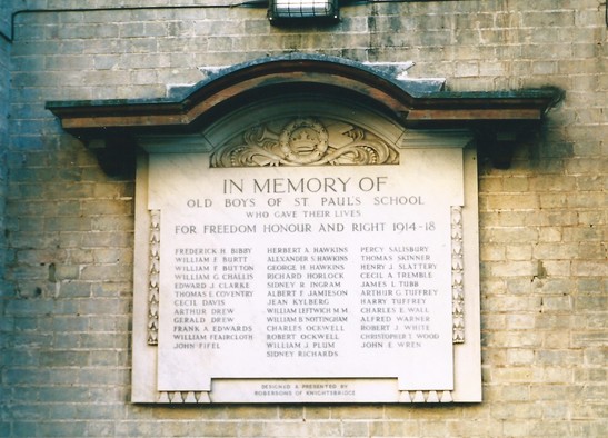 IN MEMORY OF/OLD BOYS OF ST PAUL'S SCHOOL/WHO GAVE THEIR LIVES/FOR FREEDOM HONOUR AND RIGHT 1914-18/[names in 3 columns]/DESIGNED & PRESENTED BY/ROBERSONS OF KNIGHTSBRIDGE