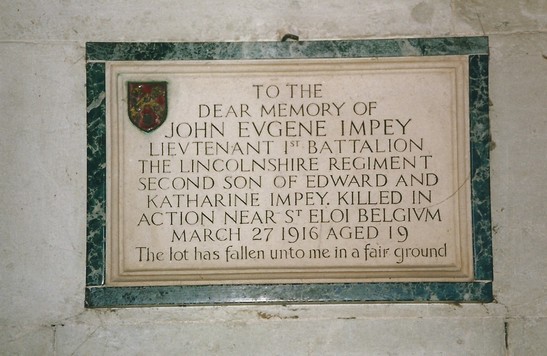 TO THE/ DEAR MEMORY OF/ JOHN EUGENE IMPEY/ LIEUTENANT 1ST BATTALION/ THE LINCOLNSHIRE REGIMENT/ SECOND SON OF EDWARD AND/ KATHERINE IMPEY. KILLED IN/ ACTION NEAR ST ELOI BELGIUM/ MARCH 27 1916 AGED 19/ THE LOT HAS FALLEN UNTO ME IN A FAIR GROUND