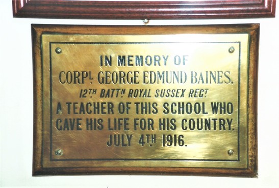 IN MEMORY OF/ CORPL GEORGE EDMUND BAINES/ 12TH BATTN ROYAL SUSSEX REGT/ A TEACHER OF THIS SCHOOL WHO/ GAVE HIS LIFE FOR HIS COUNTRY/ JULY 4TH 1916