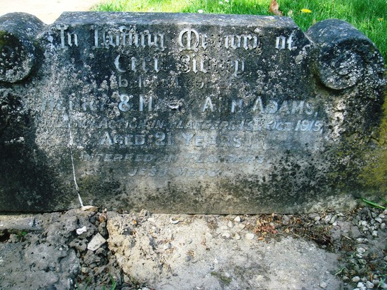 Main headstone: - [Unreadable and following information from previously recorded M I known to be incomplete. Exact wording and line spacing unknown]. Henry Adams died 26th March 1926 aged 73. Mary Ann wife of the above died 23rd Oct 1951 aged 93. Secondary headstone: - In Loving Memory of/ Cecil Sydney/ beloved son of/ HENRY & MARY ANN ADAMS,/ KILLED IN ACTION IN FLANDERS 13TH OCT 1915,/ AGED 21 YEARS./ INTERRED IN FLANDERS/ JESU MERCY