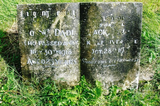 Left face: In Loving Memory /of/ THOS Wm DADE/ WHO PASSED AWAY/ NOV 30TH 1918/ AGED 25 YEARS Right face: ALSO OF/ HIS BROTHER/ JACK DADE/ KILLED IN FRANCE/ OCT. 28TH 1917/ A ???/ SHORT TOIL ETERNAL REST