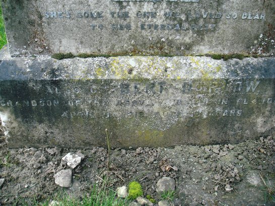 Head stone:- IN/ LOVING MEMORY OF/ FREDERICK SHARPE/ (OF BASTON FEN MARKET DEEPING)/ WHO ENTERED INTO REST AUGUST 3RD 1900/ AGED 60 YEARS./ NEITHER SHALL THERE BE ANYMORE PAIN./ ROCK OF AGES CLEFT FOR ME/ LET ME HIDE MYSELF IN THEE./ ALSO MARY ANN./ WIDOW OF THE ABOVE/ DIED NOVR 22ND 1909/ AGED 70 YEARS./ SHE’S GONE THE ONE WE LOVED SO DEAR/ TO HER ETERNAL REST. Base stone:- ALSO OF BERT DARLOW,/ GRANDSON OF THE ABOVE WHO FELL IN FRANCE/ APRIL 9TH(?) 1918 AGED 19 YEARS.