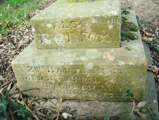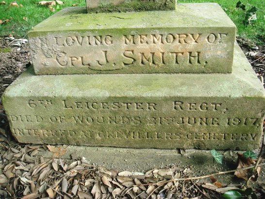 Front face: In loving memory of/ Cpl J. Smith,/ 6th Leicester Regt,/ died of wounds 21st June 1917, interred at Grevillers Cemetery. Left face: also / Pte F. Fox, / 2nd Hants Regt, / died 11th April 1918 / interred at / La Kreule Cemetery