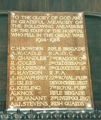 TO THE GLORY OF GOD AND/ IN GRATEFUL MEMORY OF/ THE FOLLOWING MEMBERS/ OF THE STAFF OF THE HOSPITAL/ WHO FELL IN THE GREAT WAR/ 1914 - 1918/ (NAMES)