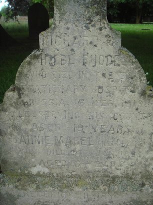 Cross: Inscription on cross unreadable. Body of headstone: RICHARD &(?)/ PHOEBE RHODES/ WHO DIED IN THE 5TH(?)/ STATIONARY HOSPITAL/ RUSSIA 15TH (???) 1919/ WHILE SERVING HIS COUNTRY/ AGED 19 YEARS/ ALSO ANNIE MABEL THEIR DAUGHTER/ WHO DIED 4TH(?) JAN(?) 19??/ AGED 3 YEARS/ ALSO FREDERICK HENRY DIED/ (following lettering unreadable)