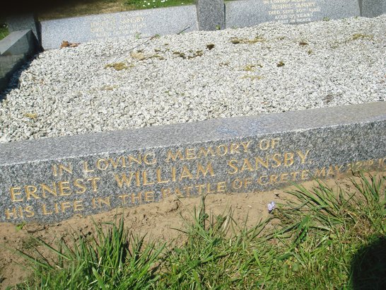Top kerb: Left: IN LOVING MEMORY OF/ JOSEPH SANSBY/ DIED SEPT 20TH 1945/ AGED 60 YEARS/ IN SILENCE WE REMEMBER. Centre: IN LOVING MEMORY OF/ JENNIE SANSBY/ DIED SEPT 26TH 1982/ AGED 95 YEARS/ REST IN PEACE Right: IN LOVING MEMORY OF/ THOMAS ? ?/ DIED DEC ? ?/ AGED 55 YEARS/ (Line unreadable) Bottom kerb: IN LOVING MEMORY OF/ ERNEST WILLIAM SANSBY/ LOST HIS LIFE IN THE BATTLE OF CRETE MAY 22ND 1941