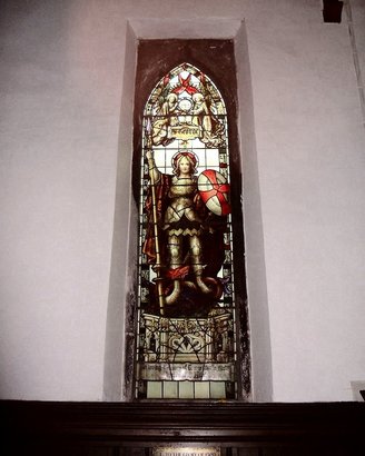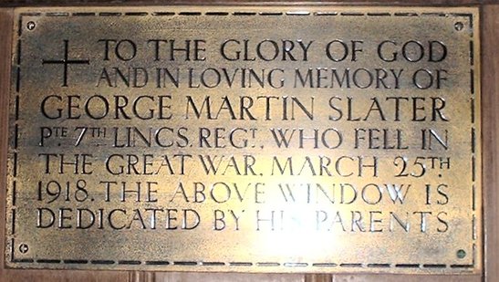 Plaque: To the Glory of God/ And in Loving Memory of/ George Martin Slater/ Pte. 7th Lincs. Regt., Who fell in/ The Great War, March 25th/ 1918. The Above Window is/ Dedicated by his Parents. Window: In Loving Memory of George Martin Slater/ Buried at St Hilaire