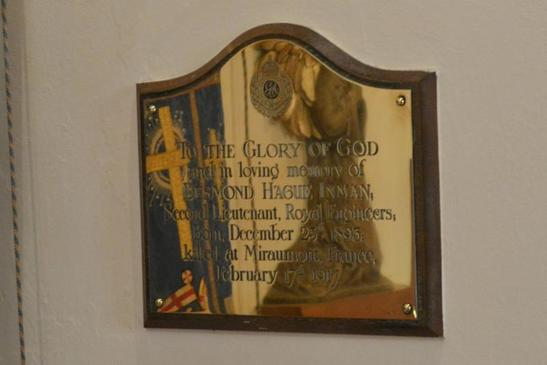 To the glory of God and in loving memory of Desmond Hague Inman Second Lieutenant Royal Engineers. Born December 25th 1893. Killed at Miraumon France February 17th 1917