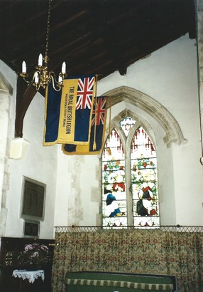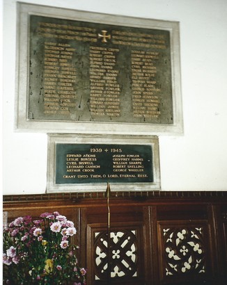 IN HONOUR OF THE RESURRECTION OF OUR LORD JESUS CHRIST AND TO THE/ TO THE MEMORY OF THOSE MEN OF THE PARISH WHO FELL IN THE SERVICE OF THEIR/ COUNTRY IN THE GREAT WAR 1914-1918 THIS WINDOW AND TABLET ARE DEDICATED/ (Names)
