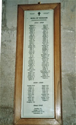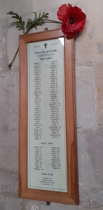 There is no greater love than this ... / ... to lay down one's life for one's friends / ROLL OF HONOUR / THE NAMES OF THE MEN AND WOMEN OF THIS PARISH / WHO HAVE GIVEN THEIR LIVES FOR THEIR COUNTRY. / 1914-1918 / (names x 83) / 1939-1945 / (names x 23) / Since 1945 / (names x 4)