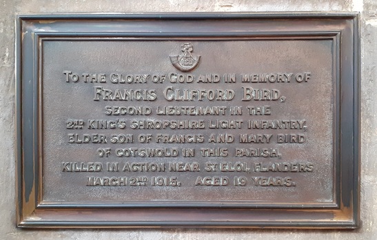 TO THE GLORY OF GOD AND IN MEMORY OF / FRANCIS CLIFFORD BIRD, / SECOND LIEUTENANT IN THE / 2ND KING'S SHROPSHIRE LIGHT INFANTRY, / ELDER SON OF FRANCIS AND MARY BIRD / OF COTSWOLD IN THIS PARISH, / KILLED IN ACTION NEAR ST ELOI, FLANDERS / MARCH 2ND 1915, AGED 19 YEARS.