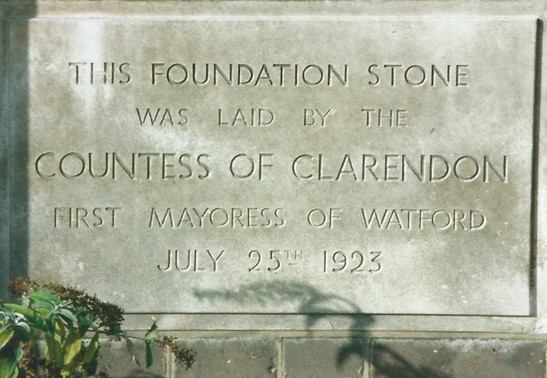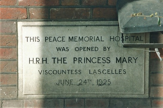 Left Tablet: THIS FOUNDATION STONE/ WAS LAID BY THE/ COUNTESS OF CLARENDON/ FIRST MAYORESS OF WATFORD/ JULY 25TH 1923 Right Tablet: THIS PEACE MEMORIAL HOSPITAL/ WAS OPENED BY/ H.R.H. THE PRINCESS MARY/ VISCOUNTESS LASCELLES/ JUNE 24TH 1925 Plaque: THE PEACE HOSPICE / OPENED BY / HER ROYAL HIGHNESS / PRINCESS MICHAEL OF KENT / ON 25TH SEPTEMEBR 1996 / GENEROUSLY RESTORED BY AND FOR THE CARE OF THE PEOPLE OF SOUTH WEST HERTFORDSHIRE