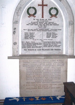 WW1 Tablet: TO THE GLORY OF GOD / AND TO ENDHRINE / IN LASTING MEMORY AND HNOOUR / THE NAMES OF THOSE FROM THIS VILLAGE / WHO GAVE THEIR LIVES FOR THEIR KING AND COUNTRY / IN THE WAR /1914-1919 / (Names) / ALL OF THE ROYAL SUSSEX REGIMENT / (Names) / THE TRIBUTE OF THEIR RELATIONS AND FRIENDS WW2 Tablet: ROYAL NAVY (Names) / ARMY (Names) / ROYAL AIR FORCE (Names) / MERCHANT NAVY (Name) / YE WHO LIVE IN ENGLAND'S PASTURES GREEN /REMEMBER US /AND THINK OF WHAT MIGHT HAVE BEEN / 1939 1945