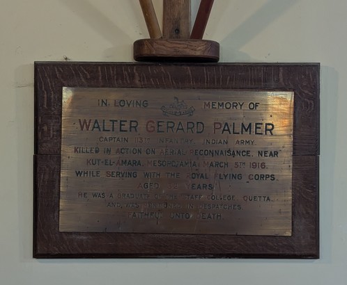 IN LOVING MEMORY OF / WALTER GERARD PALMER / CAPTAIN 113TH INFANTRY, INDIAN ARMY. / KILLED IN ACTION ON AERIAL RECONNAISANCE, NEAR / KUT-EL-AMARA, MESOPOTAMIA, MARCH 5TH 1916. / WHILE SERVING WITH THE ROYAL FLYING CORPS. / AGED 32 YEARS / HE WAS A GRADUATE OF THE STAFF COLLEGE, QUETTA. / AND WAS MENTIONED IN DESPATCHES. / FAITHFUL UNTO DEATH.